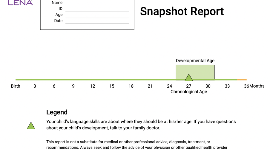 These statistics are converted into feedback reports that parents receive each week. To monitor their child’s progress, parents also complete the LENA Developmental Snapshot, a parent-report survey that assesses language skills and measures their child’s developmental milestones in comparison to peers of the same age.